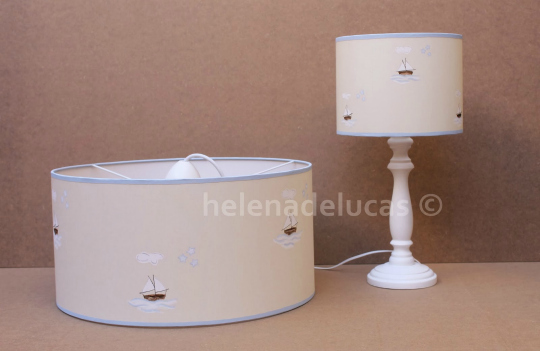Qué dulzura de lámparas, pantallas de techo a juego con lámparas de sobremesa, ambas de forma cilíndrica, pintadas a mano con los colores y diseños que prefieras.
